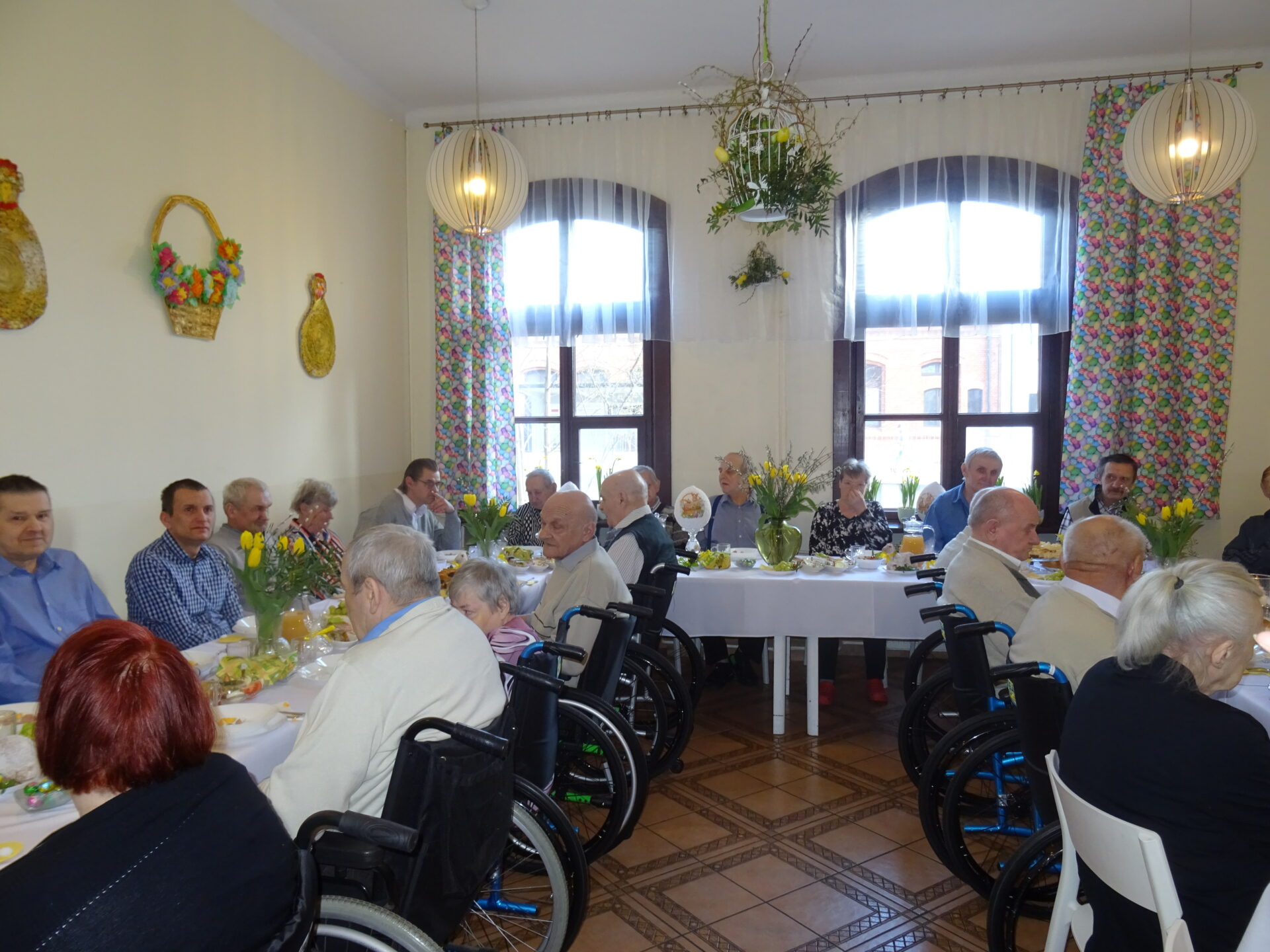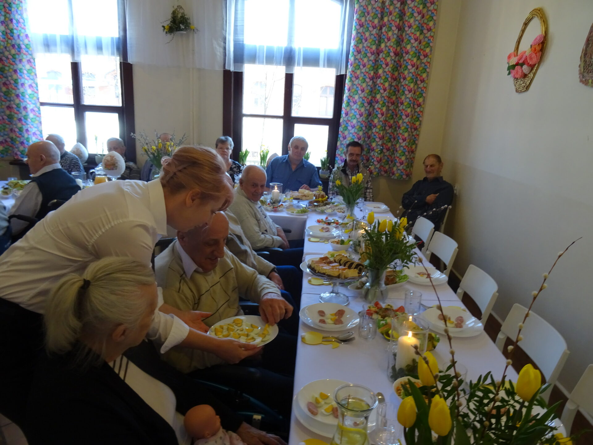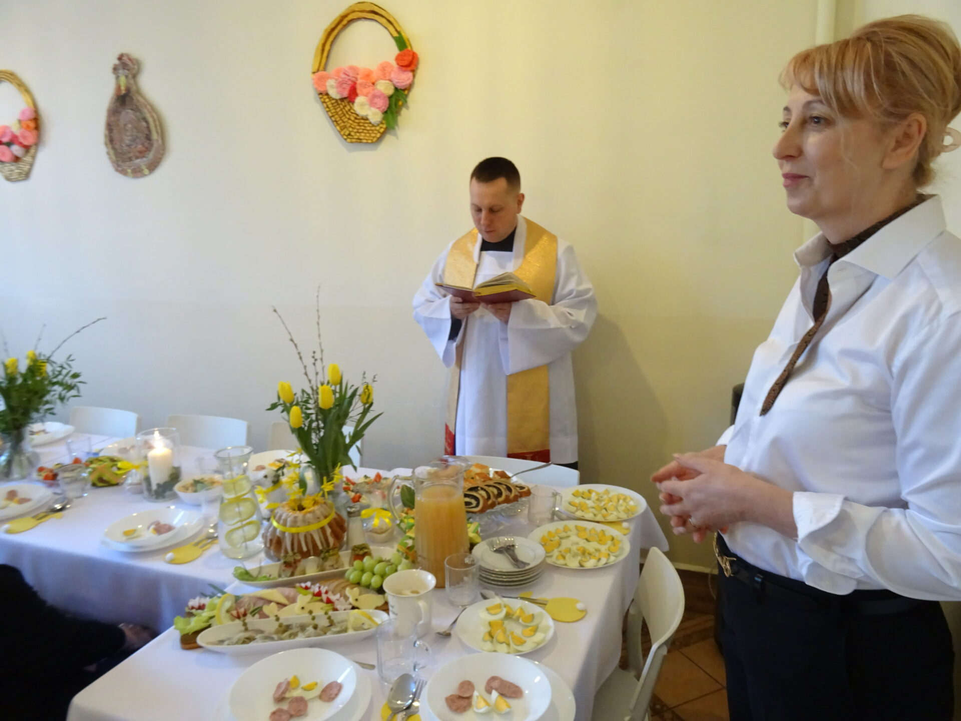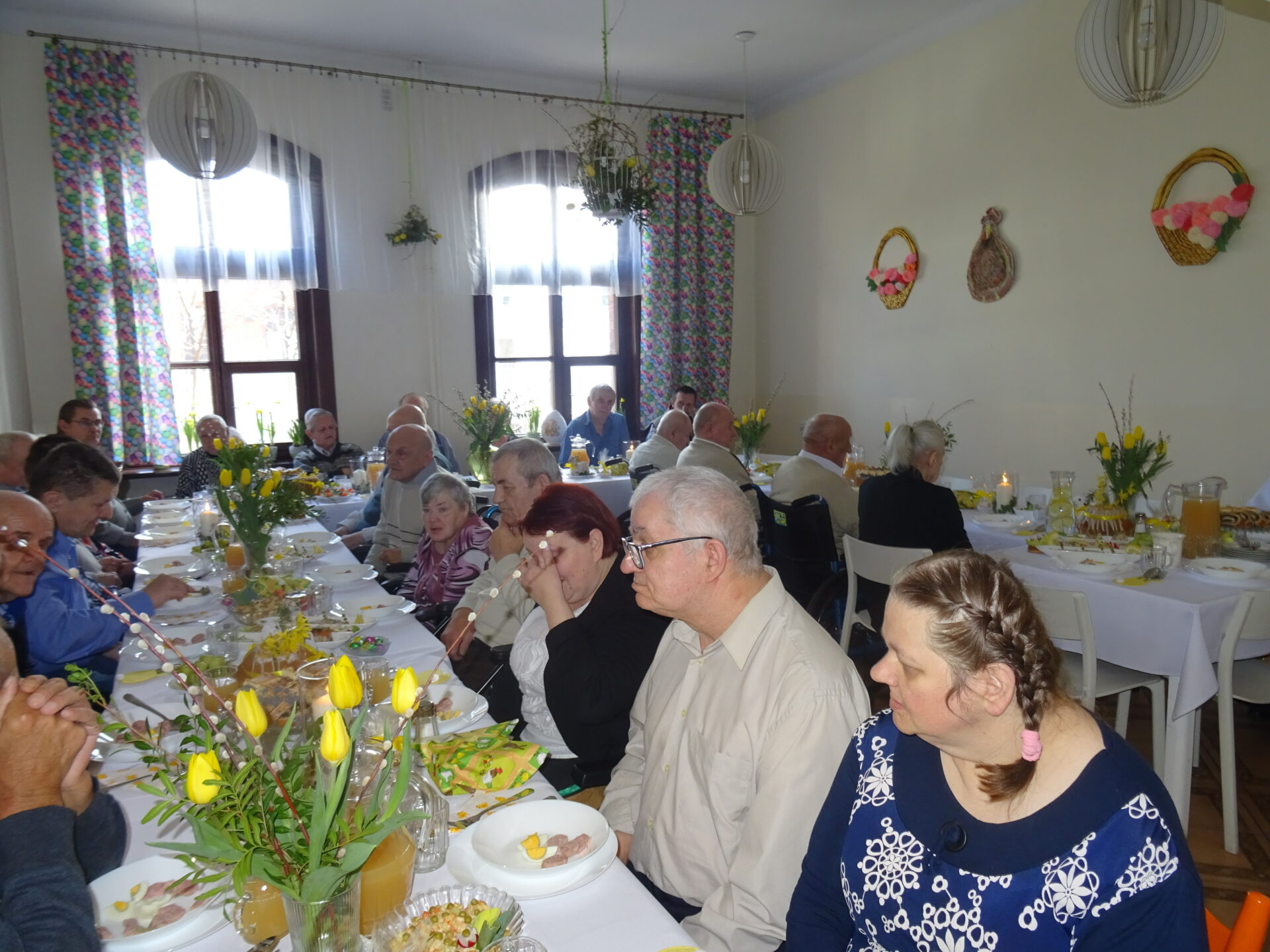Wielkanoc, jeśli rozważać holistycznie, nie posiada realnego uzasadnienia w Słowie Bożym. Easter (po polsku właśnie WIELKANOC), jak wskazuje Beda Czcigodny (Św. Kościoła Katolickiego), wywodzi się od pogańskiej bogini wiosny – Eostre oraz obchodów na jej cześć. Jej nadejście od zawsze symbolizuje płodność, odrodzenie i wiąże się z rozkwitem kolorów. Tych ostatnich nie zabrakło w naszych świątecznych ozdobach, kiedy wspólnie zasiedliśmy środowego poranka do śniadania wielkanocnego. Pięknie przystrojona świetlica ledwo pomieściła wszystkich chętnych. Ale spokojnie, dla nikogo nie brakło miejsca. Wraz z nami w uroczystym spotkaniu wziął udział Ksiądz Rafał z Parafii Matki Bożej Pocieszenia w Żyrardowie, który pobłogosławił nam i pokarmy na stołach. Iście rodzinna atmosfera towarzyszyła nam przez cały czas. Nikomu nie odbiła palma, nikt nie poczuł się zbaraniały. Serca każdego wypełniła miłość Zmartwychwstałego Zbawiciela.